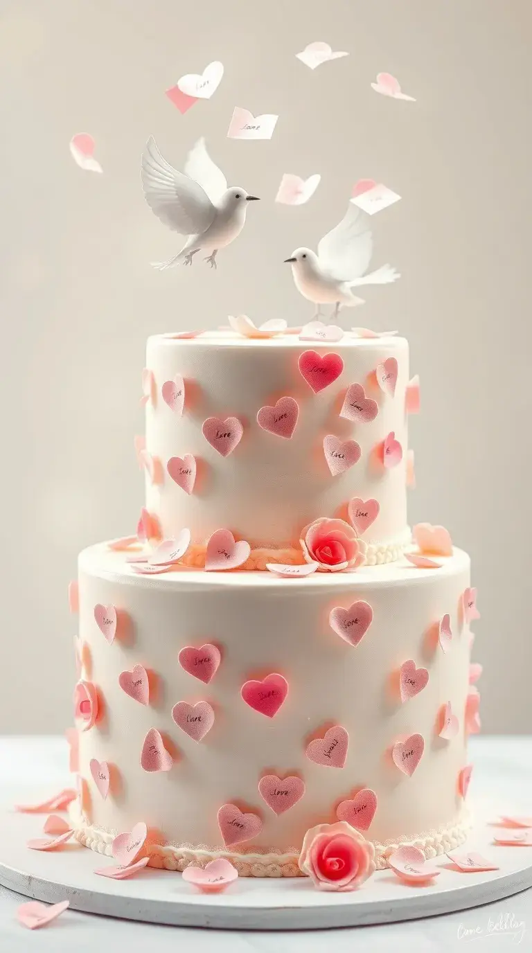 There are many symbols of love and weddings. Here is a unique cake that incorporates a pair of doves and edible heart shaped confetti for a beautifully decorated cake for any anniversay year.