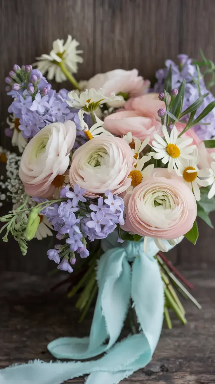 Soft hues of peach, lilac, and pale yellow make this bouquet dreamy and romantic.