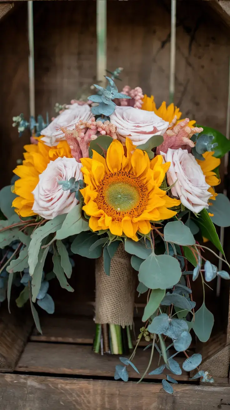 Bold and bright, this bouquet pairs sunflowers with eucalyptus and wild roses for a stunning contrast.