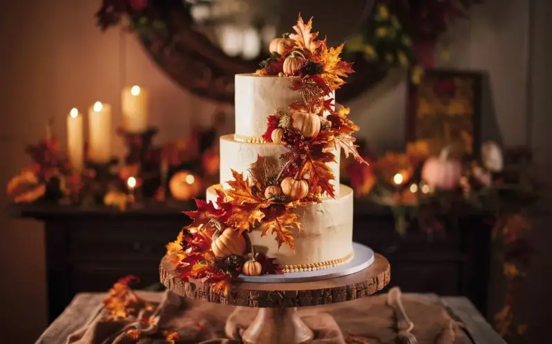 If you're looking to make a bold statement, embrace the harvest season with a striking, multi-tiered cake decorated with fondant leaves, acorns, and other natural elements. This stunning centerpiece will not only wow your guests but also seamlessly integrate with the autumnal ambiance of your special day.