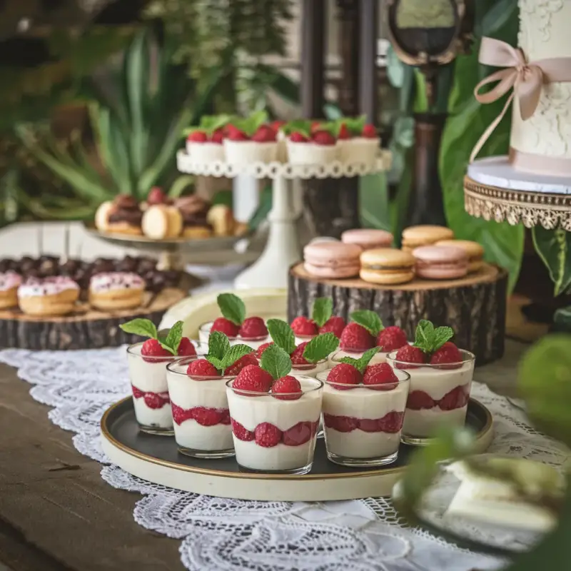 Topped with a fresh raspberry and a sprig of mint, these mousse cups are a stunning addition to any wedding dessert table and provide a perfect balance of sweet and tangy.