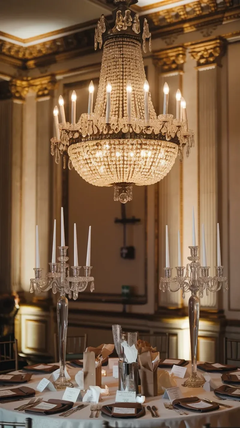 Vintage crystal chandelier in a grand ballroom, casting a warm glow over a guest table.