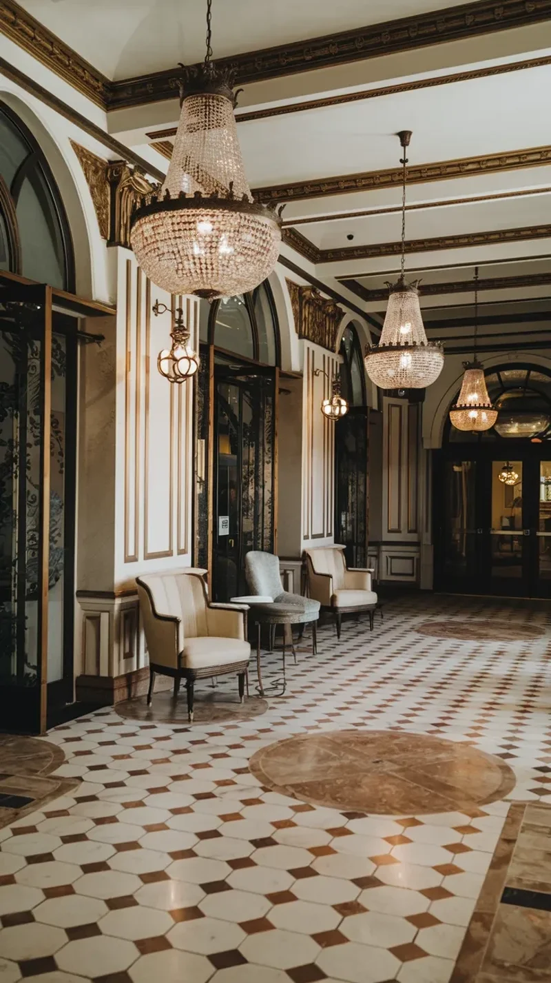 Old world patterned tile floor in an elegant wedding venue, enhancing the old money aesthetic.