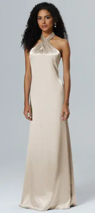 A classy bridesmaid dress with a halter neckline and mermaid cut silhouette