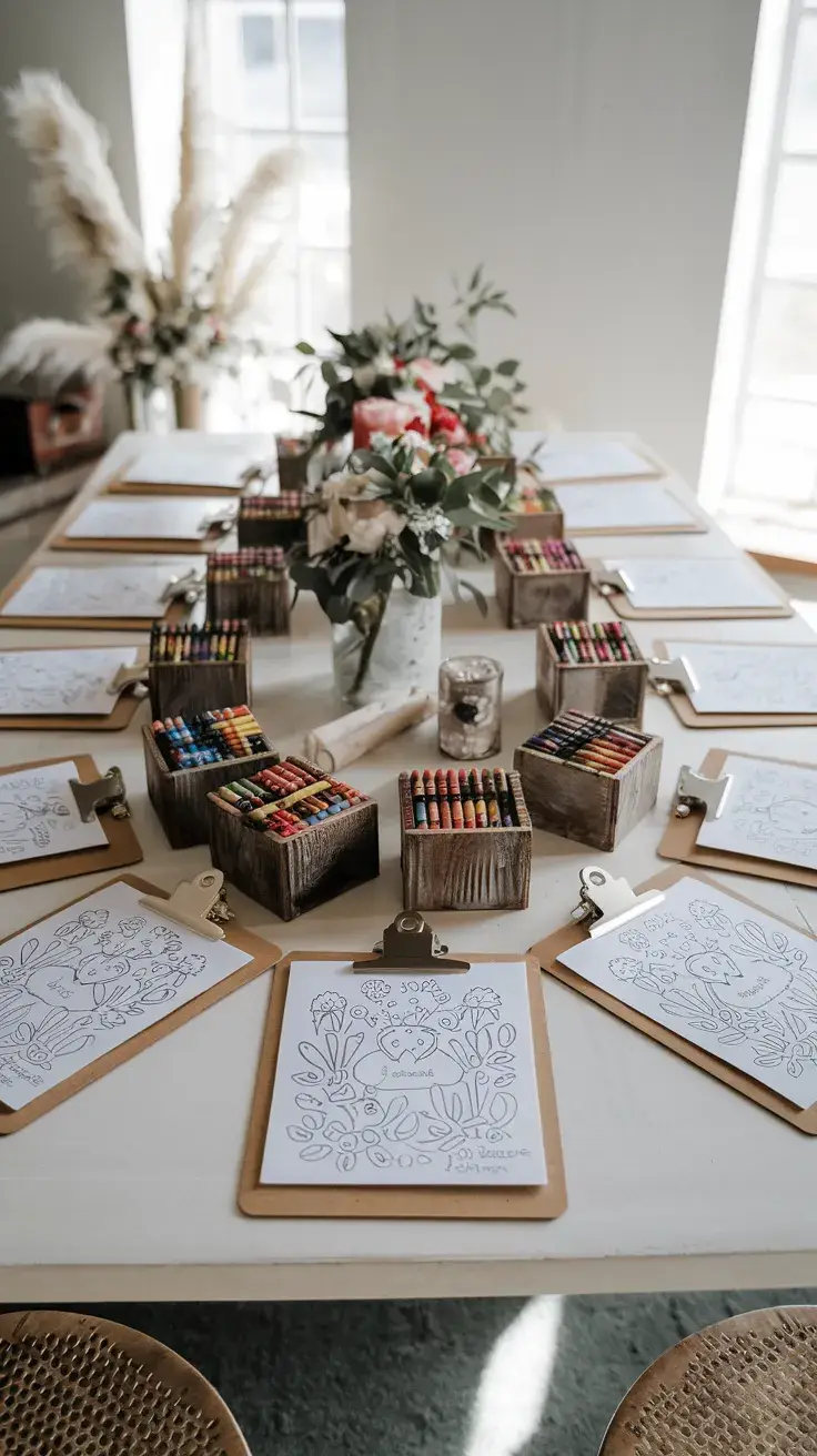Set up clipboards with pre-printed wedding-themed coloring sheets and crayons. This simple yet effective activity is a no-brainer.