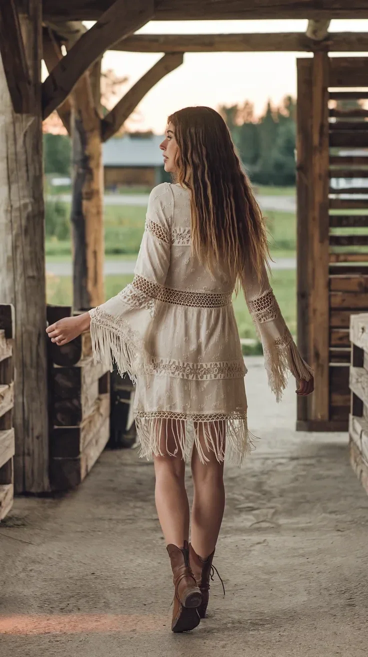 Embrace the boho vibe with this dress featuring layers of fringe, giving you movement as you walk. It's paired with cowboy boots for an authentic cowgirl look, ideal for outdoor settings.