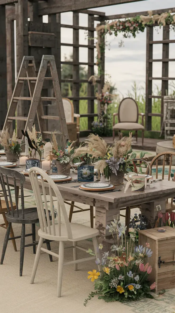 Whether placed at the altar or as a backdrop for photos, the boho-chic vibe created by wildflowers, greenery, and natural elements is unparalleled. This simple yet elegant décor instantly brings a dreamy, organic feel to any wedding.