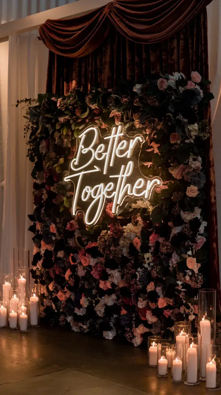 A wall of lush greenery paired with a custom neon sign featuring your names or a meaningful phrase creates a modern and Instagram-worthy focal point.