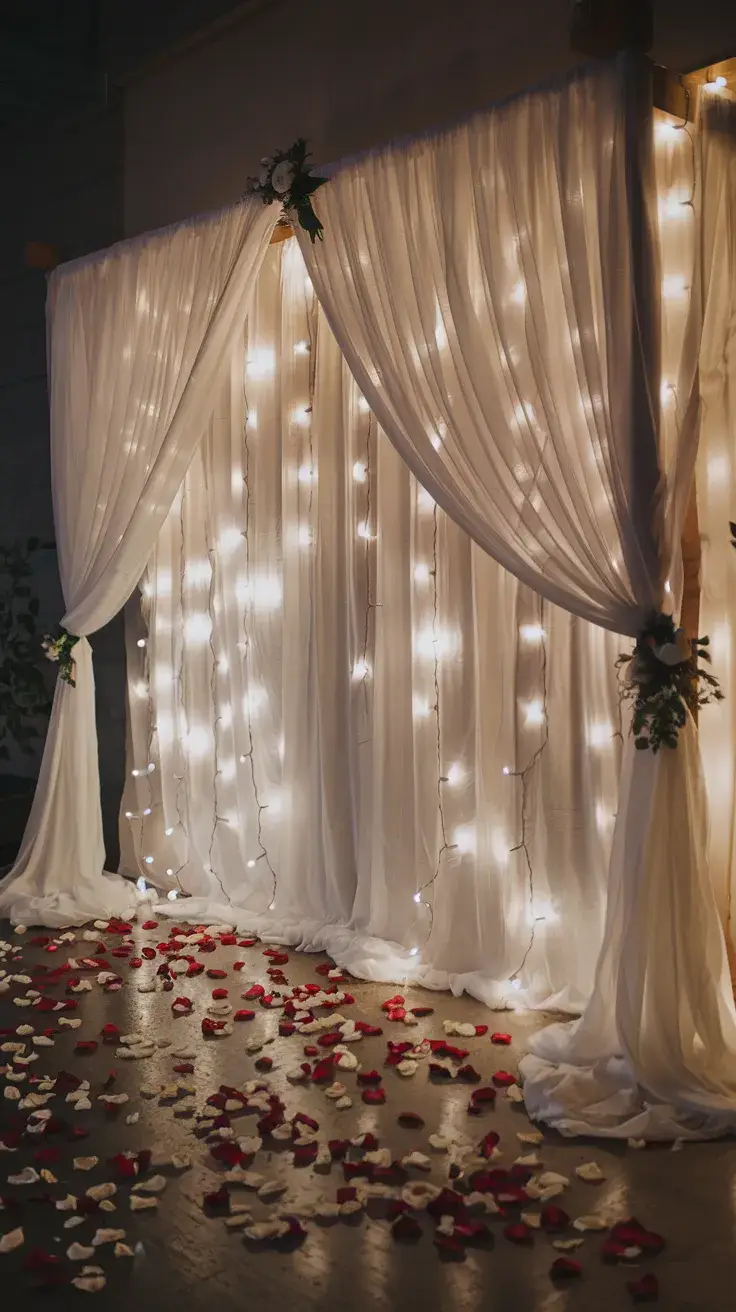A cascade of twinkling fairy lights creates a magical and serene atmosphere, perfect for evening weddings and romantic engagement parties.